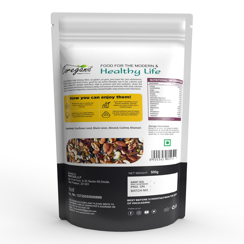 A healthy blend of carefully chosen dry fruits and crunchy nuts, our premium Mixed Dry Fruits and Nuts blend is designed to provide taste, nutrition, and energy with every bite. Sunflower seeds, almonds, cashews, black raisins, and khumani are all included in this wholesome mixture, which makes it the ideal snack for any time of day.This blend enhances general well-being, increases immunity, and gives you sustained energy because it is full of vital vitamins, minerals, fibre, and healthy fats. Perfect for adding to salads, cereals, desserts, or as a snack or gift.